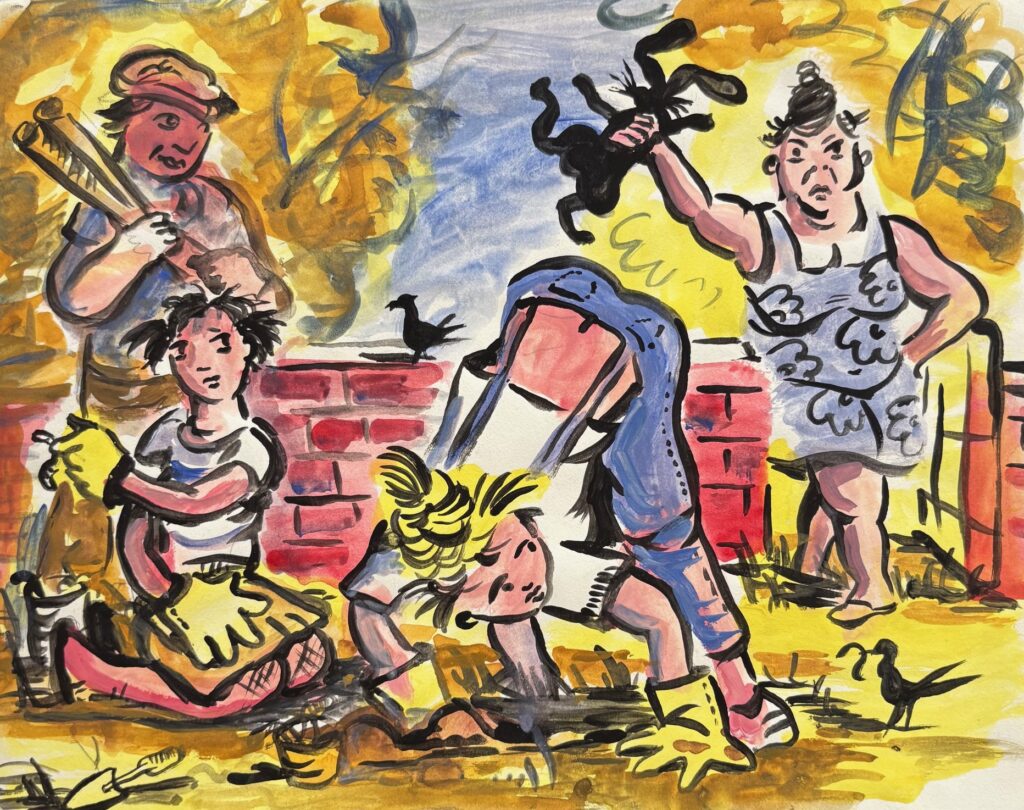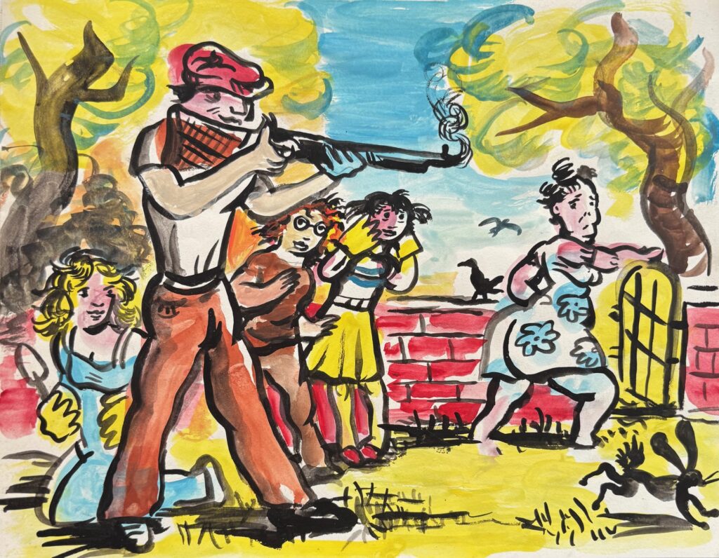 It was breakfast time and we were all young. The kitchen had a large window overlooking a  beautiful garden. Can’t remember why but dad was outside with his shot  gun shooting magpies and squirrels. We had obviously done something to annoy him as each time he killed something he strung it up on a line he had constructed outside the  window. I remember the blood dripping onto the concrete. I think we all laughed – “dad’s at it  again!”