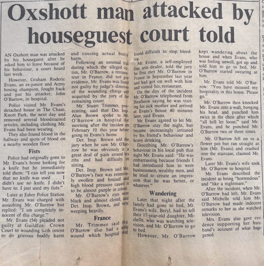 My mum was saying very calmly “Graham, Graham,” trying to bring Dad back. You could always tell by his eyes whether he was in psychopathic mode or not. I remember distinctly dropping to my knees and saying a prayer (I think for the first time ever) but I  didn’t pray for this man’s life but for dad not to kill him because I didn’t want him to go to  prison. Then dad just stopped and went into the kitchen and put the kettle on.